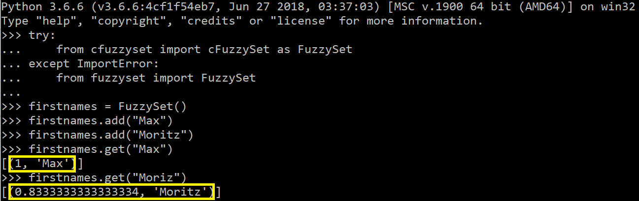 Im folgenden Beispiel wurden die beiden Namen „Max“ und „Moritz“ dem FuzzySet „firstnames“ hinzugefügt. Dadurch kann mithilfe von „get“ geprüft werden, wie sehr eine Eingabe den Wörtern des FuzzySets ähnelt. Beispielsweise hat die Eingabe „Max“ eine 100%-ige Übereinstimmung zum Wort „Max“ in „firstnames“. In die Eingabe „Moriz“ hat sich jedoch ein Tippfehler eingeschlichen, sodass lediglich fünf der Buchstaben mit dem FuzzySet-Wort „Moritz“ übereinstimmen. Damit liegt deren Übereinstimmung bei ca. 83%. Die zu filternden Entität-Schlagwortlisten-Paare können beispielsweise in einer Datenbank (database_entity_extractor [3]) oder einer .json-Datei (simple_entity_extractor [3]) hinterlegt werden. Für den folgenden Abschnitt wäre es fürs bessere Verständnis hilfreich, den database_entity_extractor [3] parallel zu öffnen und die Informationen nachzuvollziehen. Dieser verwendet eine Datenbank mit Vor- und Nachnamen als Entitäten.