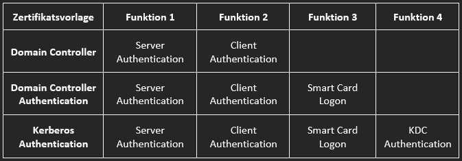 Hier lässt sich bereits erkennen, dass die Zertifikate grundlegend die gleiche Funktion haben, die Server und Client Authentication. Die Domain Controller Zertifikatsvorlage war die erste Vorlage, die für die Domain Controller Authentifizierung genutzt werden konnte (seit Windows Server 2000) und ist eine Vorlage mit der Versionsnummer 1. Mit dem Windows Server 2003 wurde die Domain Controller Authentication Zertifikatsvorlage veröffentlicht, hier wurde die Smart Card Logon Funktionalität mit in die Vorlage aufgenommen. Die Kerberos Authentication Zertifikatsvorlage wurde mit dem Windows Server 2008 veröffentlicht und hat als zusätzliche Funktion die KDC Authentication enthalten. Die beiden neueren Zertifikatsvorlagen haben jeweils die Versionsnummer 2.