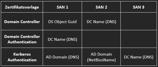 Die SAN-Einträge der einzelnen Zertifikatsvorlagen würden also standardmäßig wie folgt aussehen: