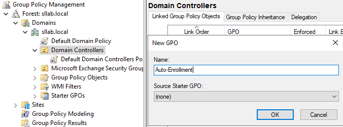 Zunächst müssen wir die Gruppenrichtlinienverwaltungskonsole (GPMC.msc) öffnen. Hier erstellen wir eine neue Richtlinie und verlinken diese mit der Domain Controllers OU.