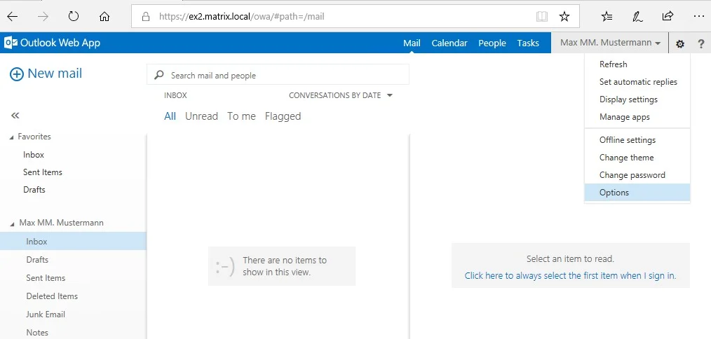 Zuerst navigieren wir in der OWA über Options zu Account.