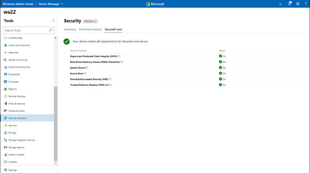 Vereinfachte Sicherheit: Durch die neue Funktionalität des Admin Center wird es vereinfacht, die Sicherheitsfeatures des Secured-Core Servers zu finden und zu konfigurieren.