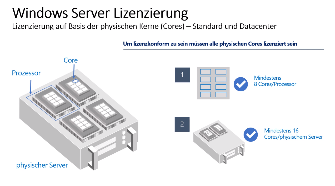 An der Lizenzierung der Standard und Datacenter Edition ändert sich nichts, d.h. die Lizenzierung erfolgt auf Basis der Prozessorkerne. Es müssen alle Prozessorkerne lizenziert werden, um lizenzkonform zu sein. In der Basis Lizenz sind 16 Kerne inkludiert, wenn ein Server mehr als 16 Kerne hat, müssen weitere Lizenzen erworben werden, beispielsweise mittels Additional Core Licenses. Hat ein Server weniger Kerne beispielsweise 8 Kerne, müssen trotzdem 16 Kerne lizenziert werden, um lizenzkonform zu bleiben. Sind alle Kerne lizenziert, stehen bei der Standard Edition zwei virtuelle Windows Server Nutzungsrechte zur Verfügung. Diese Nutzungsrechte sind stapelbar, d.h. werden erneut alle Kerne lizenziert stehen zusätzlich zwei weitere Nutzungsrechte zur Verfügung. Bei der Datacenter Edition stehen bei einem volllizenzierten Server unlimitiert viele virtuelle Windows Server Nutzungsrechte zur Verfügung.