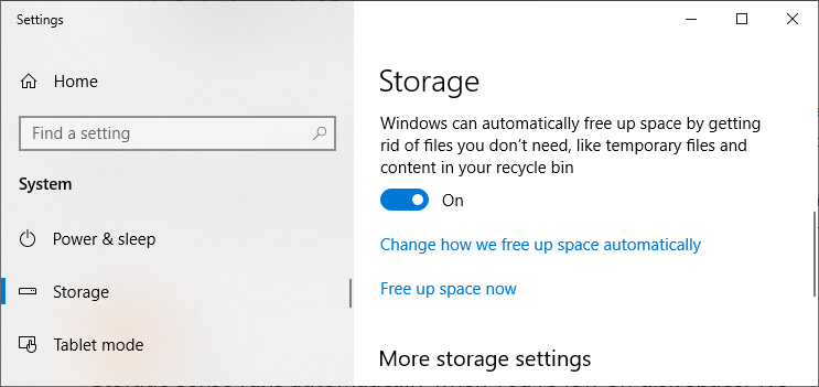 Auf einem Windows 10 Gerät können die Einstellung zu Storage Sense in der Settings App unter Storage konfiguriert werden. Wenn hier lediglich Storage Space aktiviert wird, ohne weitere Einstellungen vorzunehmen, werden lediglich Daten bereinigt, wenn wenig Festplattenspeicher auf dem System verbleibt. In Bezug auf OneDrive bedeutet dies, dass nur offline verfügbare Dateien gelöscht werden, bis wieder ausreichend Speicher verfügbar ist.