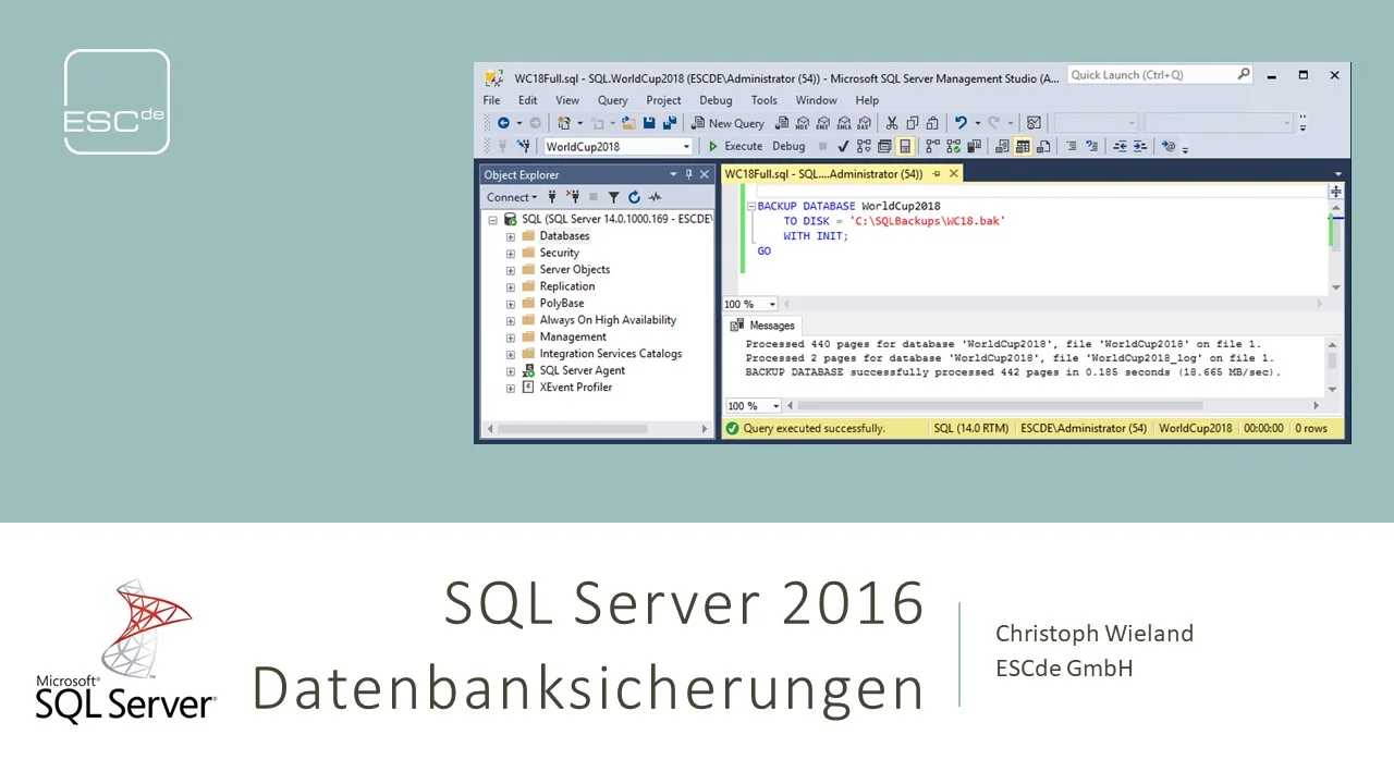 In unserem Webinar zum Thema SQL Server Backup befasst sich unser Kollege Christoph Wieland mit grundlegendem Wissen zum Sichern von SQL Server Datenbanken, das jeder Datenbankadministrator kennen sollte. Dazu führt er unter anderem die unterschiedlichen Methoden, SQL Server Datenbanken zu sichern, sowie verschiedene Methoden zur Verifikation der Backupintegrität ein. Zuletzt wird er Ihnen vorstellen, wie Sie mit Hilfe von Kompression und Verschlüsselung Ihre Datenbanksicherungen optimieren können.